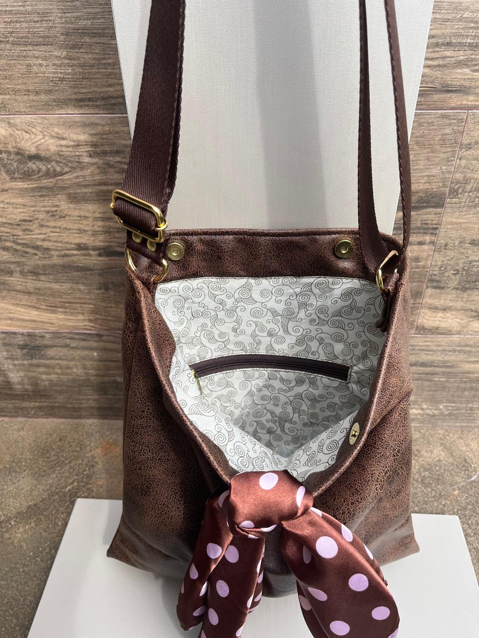 A Bolsa Hortênsia combina sofisticação e praticidade em um design atemporal. Confeccionada em material sintético com textura que remete ao couro envelhecido, sua tonalidade marrom traz um toque clássico e neutro, fácil de combinar com diversos estilos. Seu interior é forrado com tecido de estampa espiral delicada, e conta com bolso interno com zíper, ideal para manter pequenos itens organizados e seguros. O fechamento com botão magnético proporciona praticidade no dia a dia. O grande destaque fica por conta do lenço de cetim marrom com poás rosas, amarrado na parte frontal da bolsa, adicionando um charme retrô e feminino à peça. A alça regulável permite usá-la tanto no ombro quanto na transversal, adaptando-se ao seu estilo de vida. Ideal para quem busca uma bolsa funcional sem abrir mão da elegância.